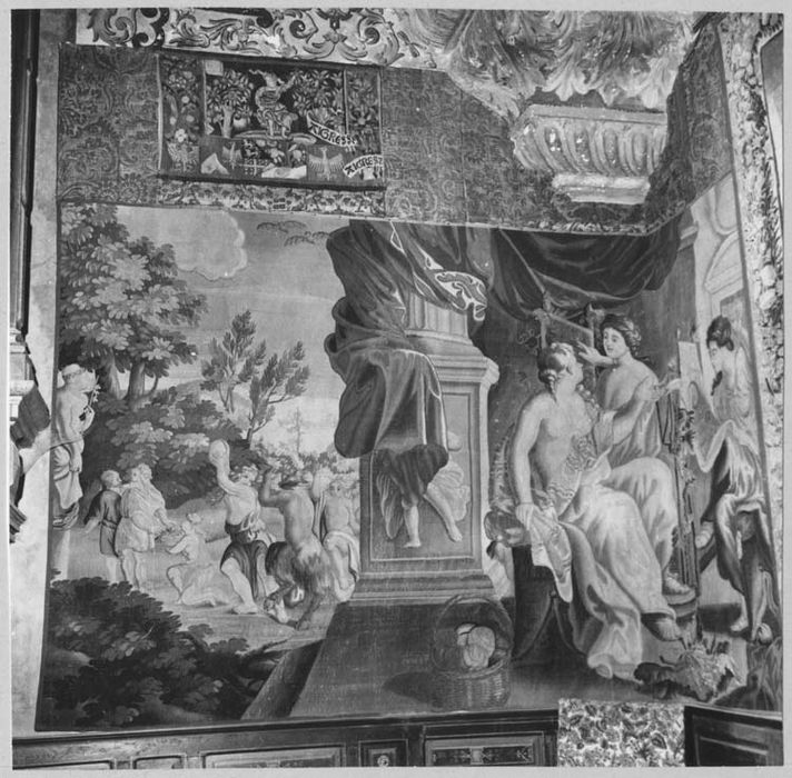 Tapisserie tissée à Londres, dans l'atelier dit « Des métamorphoses d'Ovide », par des lissiers venus d'Aubusson et d'Oudenarde, associés à des Anglais (1ère moitié 18e siècle). Le carton est peut-être inspiré d'un modèle italien. Oeuvre offerte, avec le château, au département par la famille de Hennin de Boussut-Walcourt, héritière des marquis de Bourdeilles.