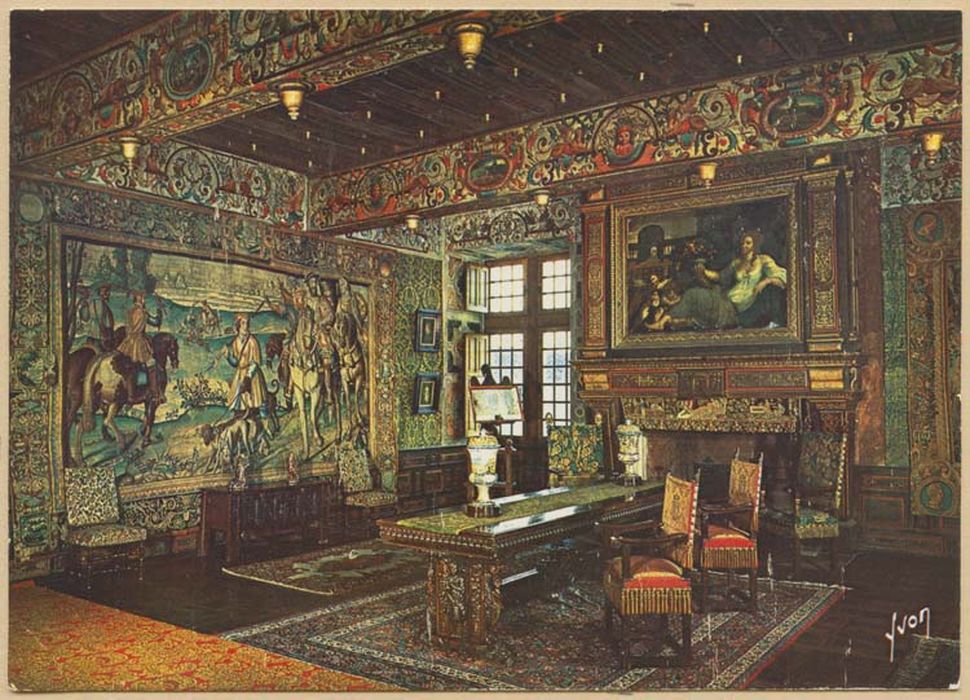 Tapisserie faisant partie d'une tenture des chasses du roi François ; l'inventaire (1627) de François de La Planche, lissier faubourg Saint Marcel à Paris, signale une série sur des cartons du peintre Laurent Guyot, sans doute copiés sur des modèles du 16e siècle ; une tenture complète, aujourd'hui perdue, se trouvait à Versailles en 1789 ; une tenture de l'ancienne collection La Foret Divonne, comprenant 8 pièces, appartient aux monuments historiques ; oeuvre offerte, avec le château, au département par la famille de Hennin de Boussut Walcourt, héritière des marquis de Bourdeilles.