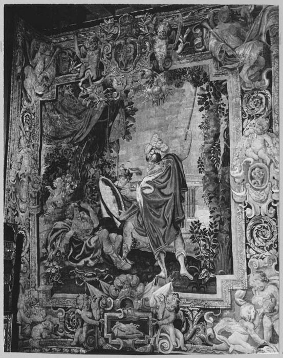 Tapisserie faisant partie d'une tenture de 8 pièces exécutée d'après le cycle de l'histoire de Renaud et d'Armide peint par Simon Vouet (1590 1649) pour l'hôtel de Bullion ; tenture tissée de nombreuses fois par l'atelier du Louvre et celui du faubourg Saint-Marcel à Paris durant la 1ère moitié du 17e siècle (une tapisserie au musée de l'Ermitage à Saint-Pétersbourg présente la même bordure) ; oeuvre offerte, avec le château, au département par la famille de Hennin de Boussut Walcourt, héritière des marquis de Bourdeilles