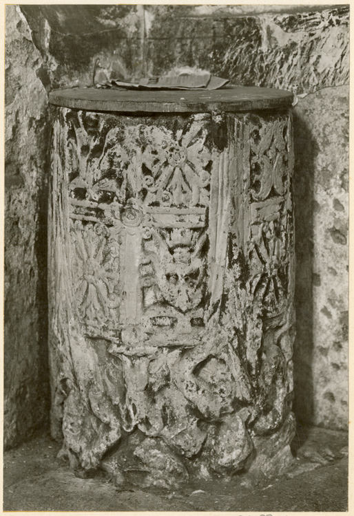 Bénitier creusé dans le tambour d'une colonne époque gallo-romaine ; panneaux rectangulaires en réserve