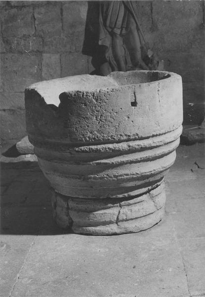 Pied en calcaire jaunâtre mouluré de tores et de cavets ; cuve en calcaire clair mouluré en 4 cavets séparés par des tores.