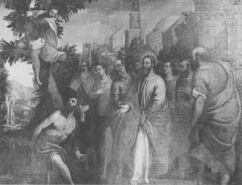 Entrée à Jérusalem (Christ, Les apôtres, Zachée, homme : aveugle : ?, agenouillé) ; fond de paysage (arbre, palais : coupole, clocher)