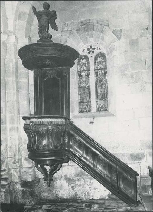 Escalier droit à rampe pleine galbée ; cuve semi-circulaire galbée, sur culot en pendentif constitué de 6 volutes affrontées découpées ; accotoir en velours à franges ; dorsal : panneau mouluré flanqué de 2 pilastres corinthiens ; abat-voix semi-circulaire à corniche moulurée