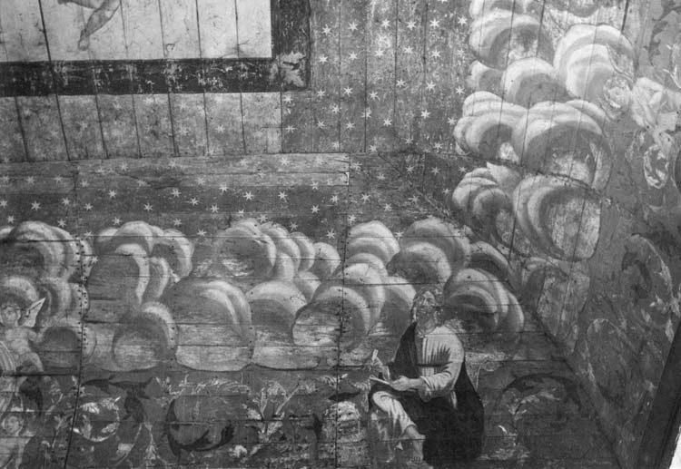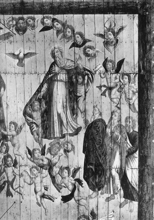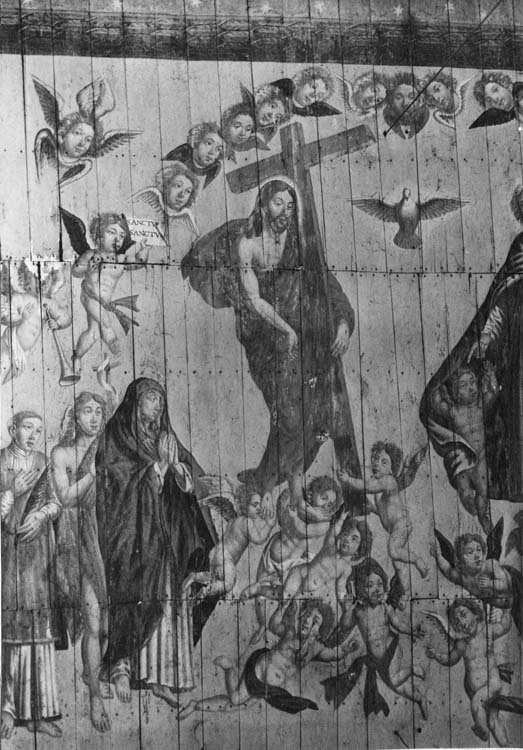 Le plafond représente également une représentation de la sainte Trinité, entourée d'anges et d'un certain nombre de prophètes et de figures saintes (entre autres, à gauche du Christ, la Vierge Marie et saint Jean-Baptiste). Au niveau de la lunette d'oculus ouest : coquilles et anges.