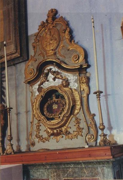 Sur la porte du tabernacle trapézoïdal : l'agneau aux sept sceaux. Au-dessus, deux têtes d'angelots ailés ; chaque arête est décorée d'une tête d'angelot ailé d'où part un bouquet tombant d'épis et de grappes. La gloire est constituée d'un triangle rayonnant portant le nom de Yaweh en hébreu. Les nuages argentés qui le supportent sont décorés de quatre têtes d'angelots ailés (celle du bras droit présentant un profil droit horizontal). Les ailes présentent un riche décor de guirlandes de fleurs. Sous un cadre arrondi, deux angelots volants en symétrie, une fleur dans la main droite. Au-dessus, boiserie à volutes, médaillon central sommé d'un pot-à-fleurs : à gauche, l'Annonciation, à droite, sainte Jeanne de Valois.