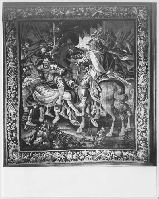 Bordure alternant fleurs, fruits, feuillages avec trophée (drapeaux, armes, tambours, trompettes). Alexandre à droite, sur son cheval tend son bras gauche. A gauche, un personnage casqué, blessé, est porté par trois soldats, devant un cavalier qui brandit une épée nue.