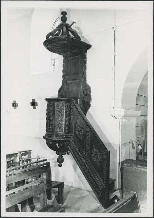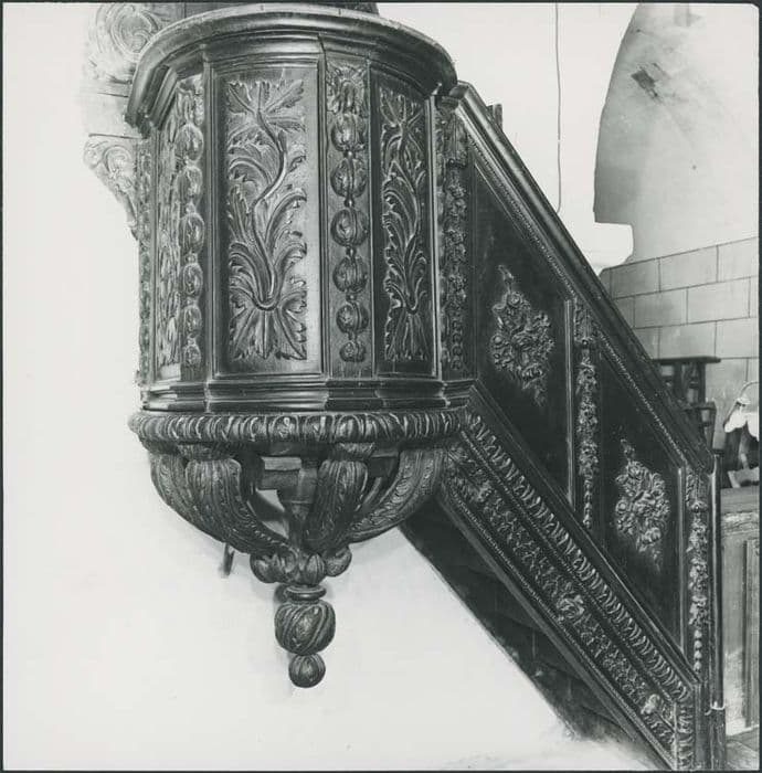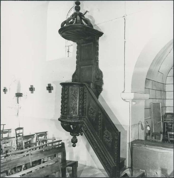 Escalier à sept marches, deux panneaux sculptés de fleurons, rampe moulurée. Base sculptée. Cuve polygonale, trois panneaux encadrés de chutes de feuillage. Bas sculpté d'un tore. Pendentif de cinq branches portant deux gros boutons. Fond à deux panneaux simples encadrés de chutes de feuillage et d'ailerons. Abat-voix mouluré, sculpté d'une vaste coquille et portant six bras incurvés sommés d'une couronne et d'un pot à feu.
