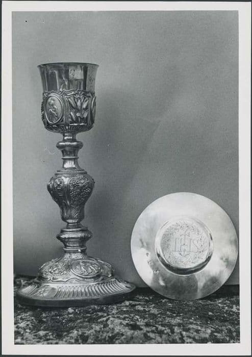 Ensemble en vermeil. Calice en vermeil repoussé, coupe unie encastrée dans un support orné de trois médaillons et d'épis de blé. Gros noeud ouvragé orné de grappes de vigne sur le pied, trois médaillons entourés de grappes de raisin, épis de blé et croix sur fond de murailles. Patène avec monogramme du Christ. Le tout entouré de rinceaux de feuillages.