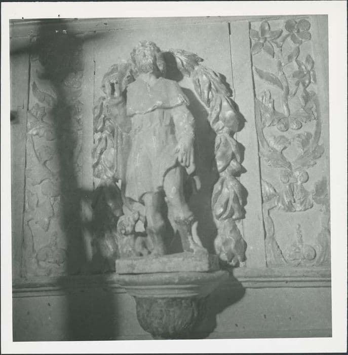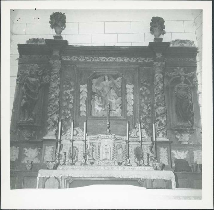 Tabernacle à trois pans, porte cintrée avec Christ en croix. Deux statues d'encadrement entre colonnettes torses : saint Roch et saint Pierre, le tout encadré de panneaux à statuettes et d'ailerons. Boiserie de fond (retable) : colonnes torses soutenant une corniche et encadrant des statues : saint Roch et sainte Catherine, bas-relief central figurant l'Assomption.