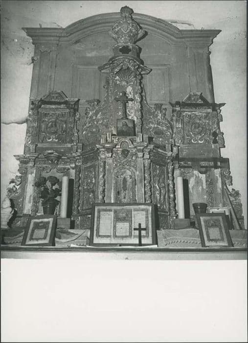 Au premier étage, tabernacle à porte cintrée (Christ en croix) encadré de panneaux sculptés de bas-reliefs (Passion) entre des colonnes torses. Petits panneaux d'encadrement. Aux deuxième étage : Christ en croix dans une niche à coquille surmontée d'une lourde composition s'achevant par un buste-reliquaire. Encadrant la niche, ailerons et panneaux sculptés de petits buste en bas-relief.