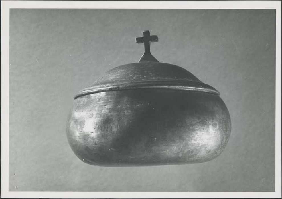 Couvercle bombé mouluré de deux filets et sommé d'une petite croix reposant sur une base pyramidale.