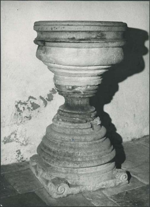 Forme en diabolo mouluré. Cavet central. Au-dessus, une dizaine de tores sont séparés par des dépressions, au-dessous, huit tores séparés par des gorges. Base quadrangulaire sculptée d'enroulements aux angles.