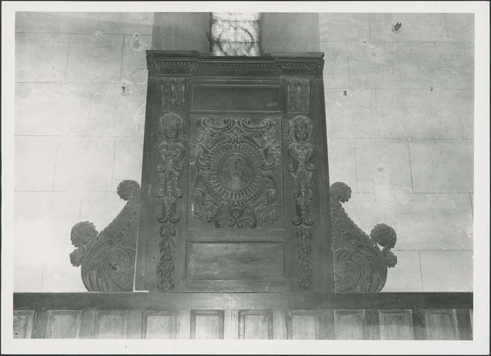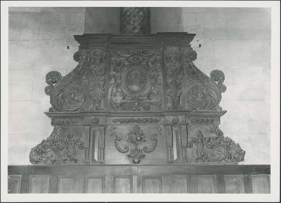 Panneau de gauche : des ailerons à enroulements encadrent un rectangle panneauté. Panneau médian sculpté d'un IHS dans un ovale rayonnant inscrit dans des cuirs baroques. Panneaux latéraux sculptés d'anges à mi-corps terminés par des chutes de feuillage. Corniche à denticules. Panneau de droite : étage inférieur avec panneau central orné de fruits et de rinceaux. Il est encadré d'ailerons orné s de feuillages.