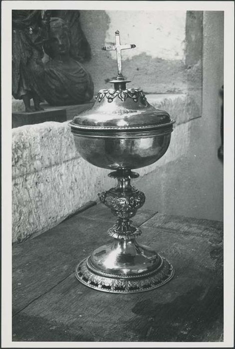 Couvercle surmonté d'une fine croix. Noeud à têtes d'anges. Pied finement découpé et orné de palmettes ajourées.