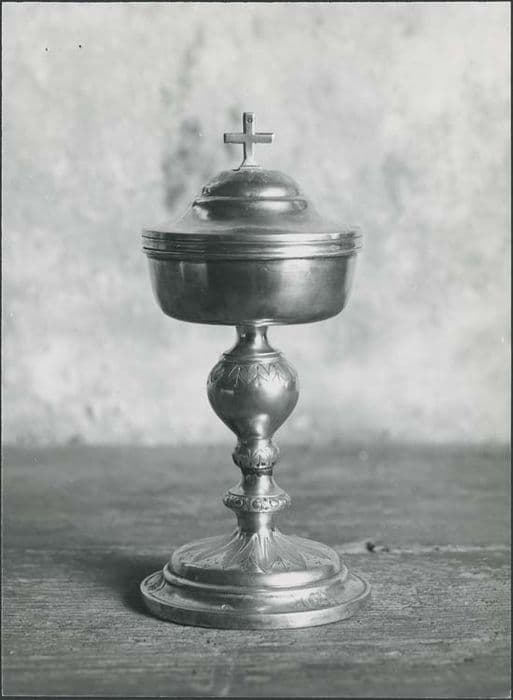 Pied à ressaut, gravé de palmettes. Noeud ovoïde au-dessus d'une bague à grènetis et d'une fausse bague. Coupe classique, large et courte. Décoration de filets.