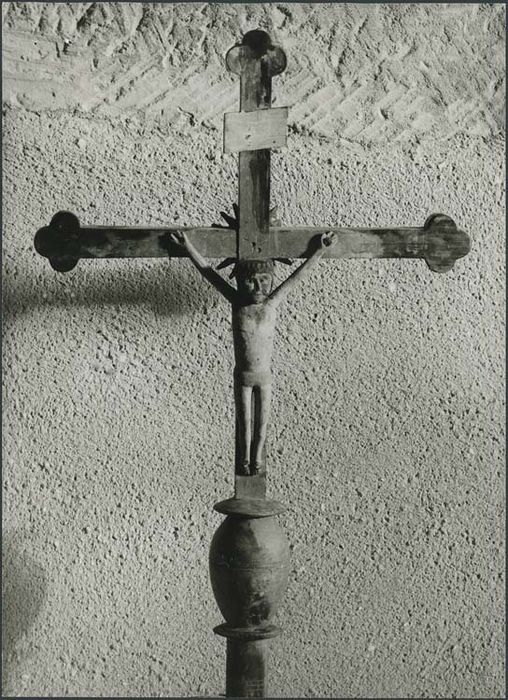 Croix fixée sur une boule dont les extrémités supportent un petit plateau faisant transition avec la croix carrée. Sur la face avant le Christ en croix, sur la face arrière un soleil découpé.