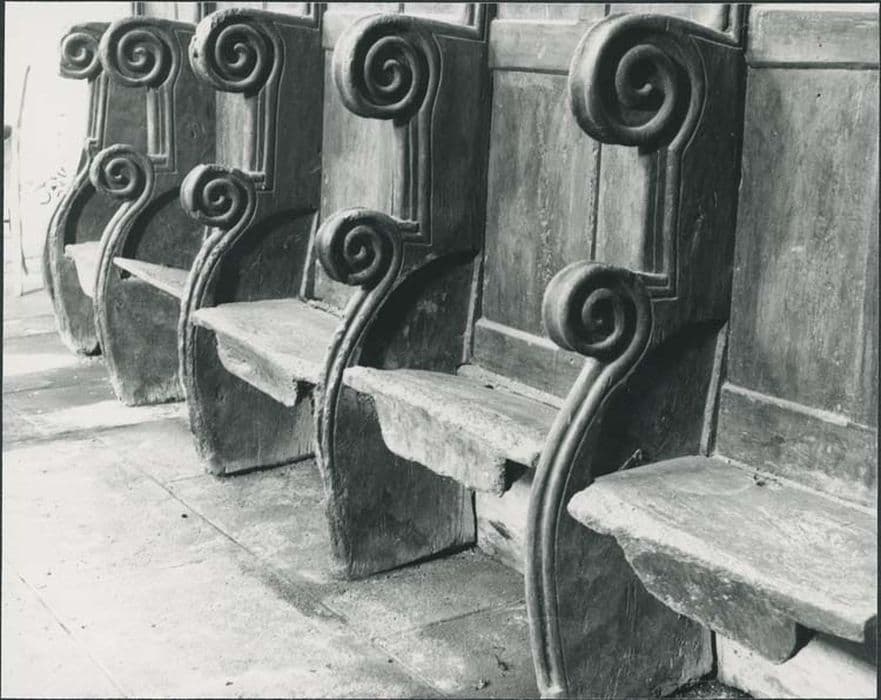 Série de cinq stalles au nord, quatre au sud. Sièges sans miséricordes. Séparations sculptées de deux enroulements. Boiseries de fond très rustiques, à panneautages réguliers.