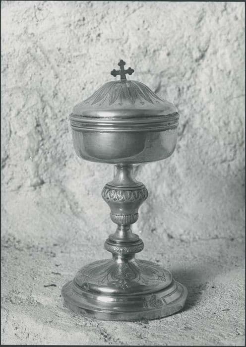 Pied gravé de fleurons. Bague à grènetis. Noeud à strigiles et à palmettes. Coupe aplatie, dont le couvercle est gravé de palmettes séparées par des tiges et fleurettes. Coupe sommée d'une croix.