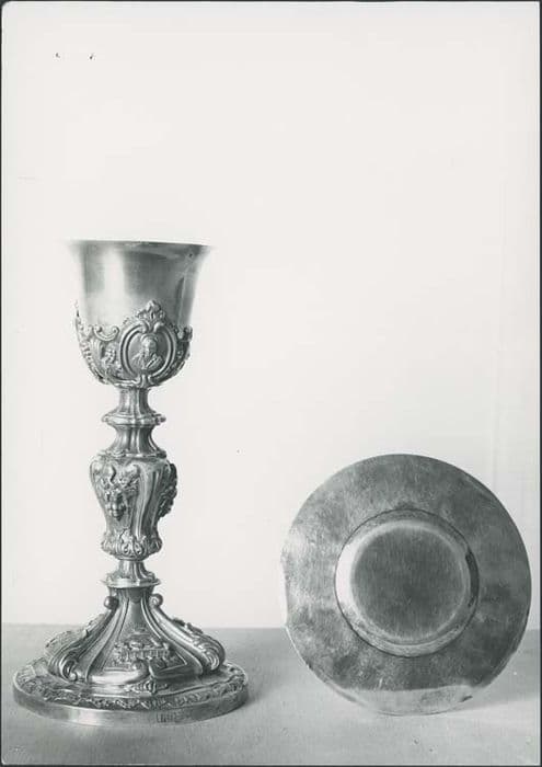 Calice au pied orné de dentelure de palmettes. Trois palmettes de fort relief séparent des cartouches (Agneau mystique, croix et deux coeurs). Noeud ovoïde de style Louis XV entre deux bagues de style rocaille. Coupe classique avec fausse coupe découpée et ornée de trois cartouches (la Vierge, le Christ et saint Jean). Patène en vermeil ornée du monogramme du Christ.