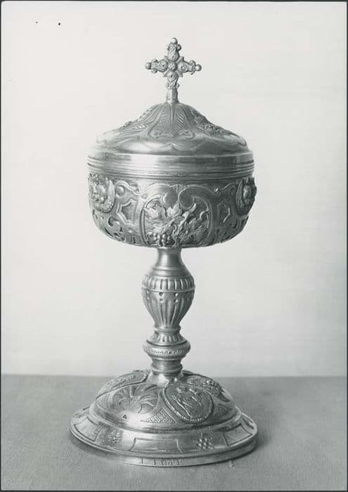 Sur le pied, trois cartouches (vertus théologales) et trois groupes (blé, grappe, roseaux). Bague à annelets. Noeud ovoïde cannelé. Coupe assez plat, fausse coupe découpée (trois cartouches, blé, vigne, roseaux, avec trois jumelages de têtes d'angelots). Couvercle sommé d'une croix et gravé de trois cartouches (blé, vigne, roseaux) et de trois autres cartouches (palmettes).