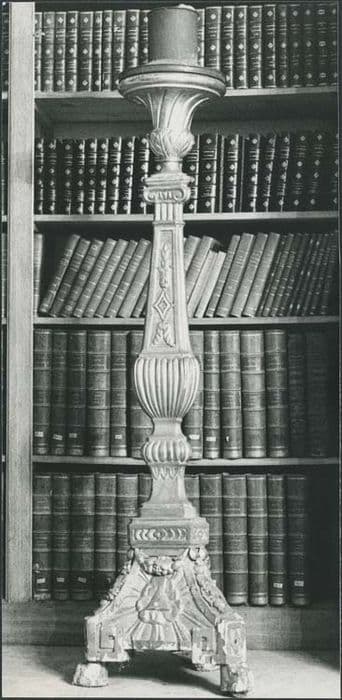 Pied triangulaire posé sur trois griffes et sculpté du Triangle trinitaire. Bague de section carrée, bague cannelée et autre bague cannelée. Elément sculpté d'un losange, partie cannelée, coupe finale sculptée de palmettes et de spires.