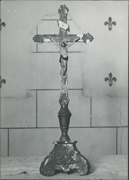 Utilisation d'un pied de chandeliers, de section triangulaire, sculpté du triangle enflammé. Croix terminée par des palmettes.