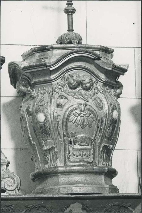 Tabernacle galbé en forme d'urne, base moulurée, porte cintrée et galbée, sculptée de l'Agneau mystique. Bandeaux décoratifs avec des jumelages de têtes d'anges. Guiche galbée supportant un thabor, porte à l'arrière. Chandeliers à pieds triangulaires, décoration de quatre bagues et d'un noeud.
