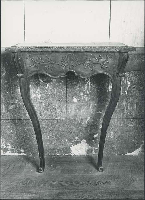 Pieds galbés (transition Louis XV-Louis XVI). La tablette supérieure, au bord décoré de festons, repose sur une partie sculptée d'une coquille entre des branchettes à petites feuilles. Cette partie a sa base découpée de courbes Louis XV. Les angles sont renforcés par des épaississements galbés.