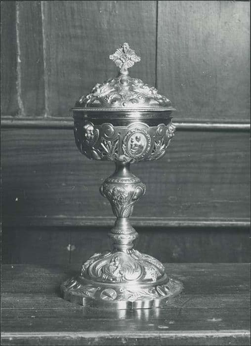 Pied avec trois cartouches à personnages. Bague. Noeud ovoïde à cartouches. Fausse coupe ajourée ornée de têtes d'angelots et de cartouches à personnages. Coupe assez plate. Couvercle très orné sommé d'une croix rayonnante.