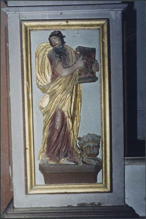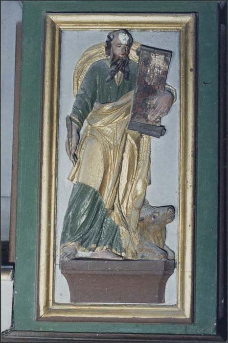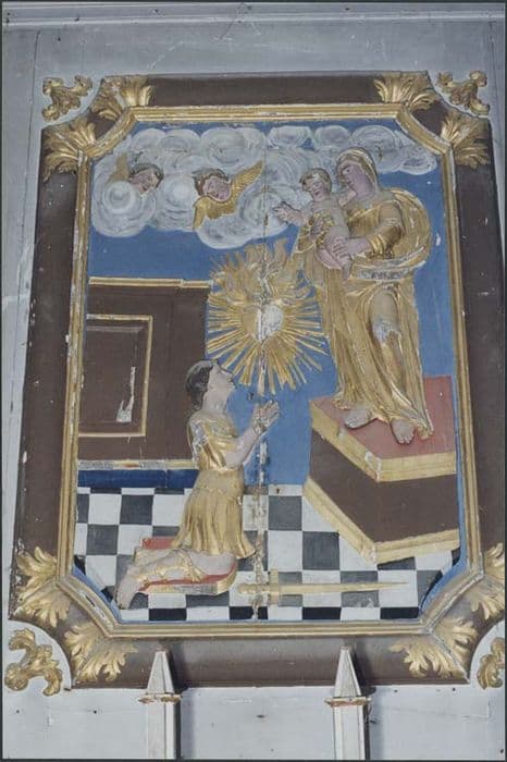 Ensemble composé par des éléments de décor d'architecture structurant le retable. Panneau cantonné de deux colonnes torses ornées de pampres de vigne, surmontées de chapiteaux corinthiens soutenant un entablement à ressauts. Grandes volutes feuillagées latérales. Piédestal des colonnes à panneaux figurés. Autel composé d'un devant d'autel à rinceaux feuillagés. Panneau central historié : saint François de Sales adolescent agenouillé aux pieds de la Vierge recevant sa vocation. Panneaux figurés : saint Marc et saint Luc.