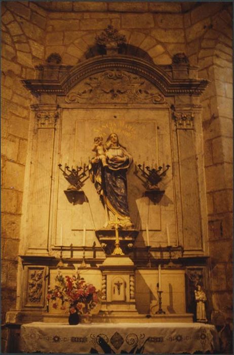 Retable à pilastres cannelés et dorés, chapiteaux corinthiens, entablement en plein cintre sommé de corbeilles de fleurs. Au-dessus de la fausse niche centrale, la colombe du Saint-Esprit.