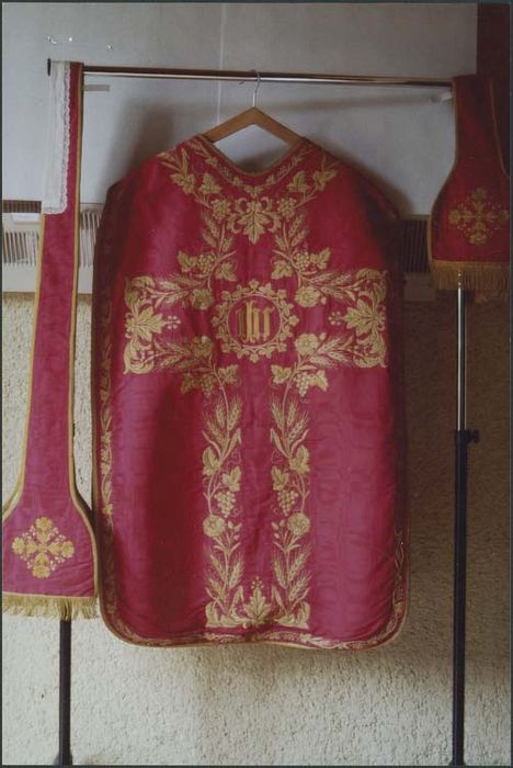 Chasuble en soie rouge moirée et broderies de soie jaunes.