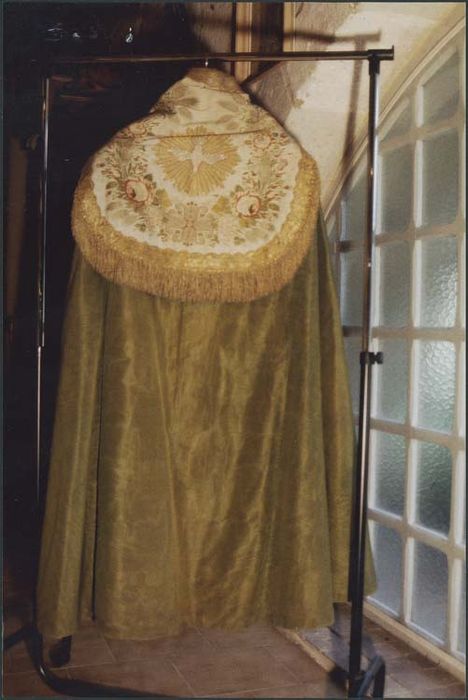 Chape de soie verte brodée, une colombe dans une gloire et des fleurs sur le chaperon.