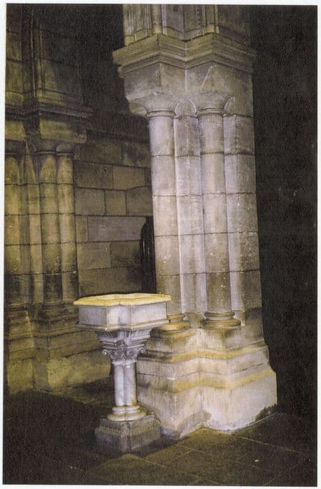 Deux bénitiers en marbre blanc au bassin en forme de croix grecque.