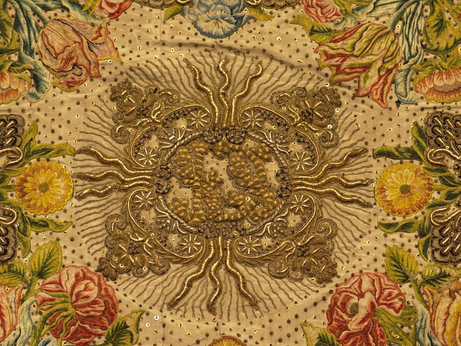 Ottoman de soie blanche brodée de fils d'or et d'argent, perles, fils de soie de couleurs, filé, lame argent, semis régulier de paillettes et cannetilles or, garniture de col en dentelle blanche, bougran, doublure de soie vert émeraude. Soies brodées au passé empiétant, peinture à l'aiguille, fils métalliques guipés. Broderie en relief.