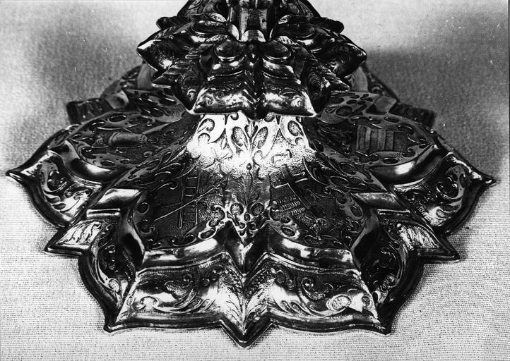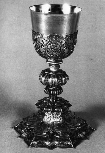 Oeuvre provenant de l'église Saint-Maurice. Le pied, la tige et le noeud (art italien) sont de la fin du 16e siècle ou du début du 17e siècle, tandis que la coupe et la fausse coupe ajourée sont du 18e siècle.