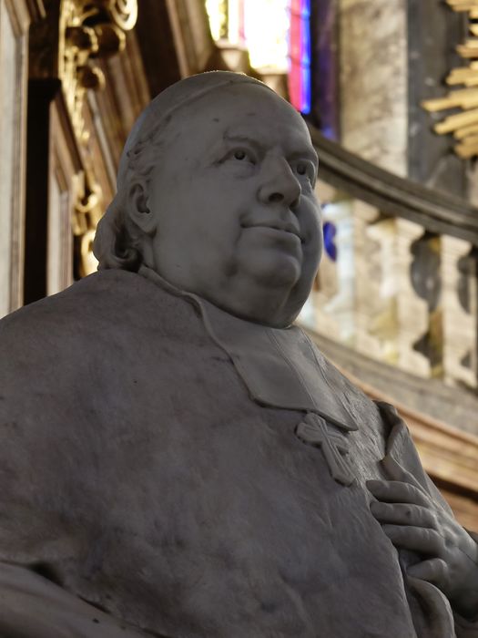 Statue de cardinal assis sur un siège, en marbre blanc, sur un haut socle portant une inscription, dont la partie avant est cintrée, la base et la partie supérieure sont moulurées. Ensemble constitué d'un bloc monolithe.