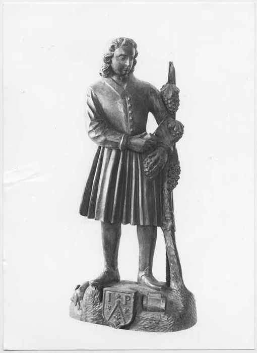 Originaire de Rhénanie, le culte de saint Vernier fut adopté par les vignerons de Besançon vers le milieu du XVIe s. En 1548, Jean Chuppin, chanoine de Sainte-Madeleine, obtint pour l'église deux reliques de cet enfant martyr, l'index de sa main droite et un fragment de son suaire. De nombreuses statues, comme c'est le cas ici, présentent le jeune vigneron en costume populaire auprès d'un cep de vigne. A ses pieds sont figurés un blason qui n'a pas été identifié à ce jour, le baril des ouvriers de la vigne et, détail pittoresque supplémentaire, un petit chien, fidèle compagnon de dures journées de labeur. (source Brochure Ville de Besançon 2010).