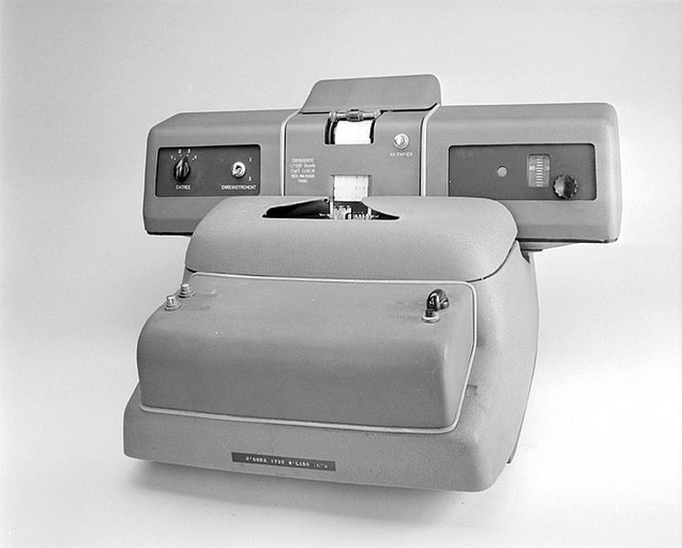 Inscription gravée sur l'avant de la machine : CHRONOGRAPHE / 1/1000 Seconde / Etab[lissemen]ts Ed. BELIN / RUEIL-MALMAISON / FRANCE. Inscription sur l'avant de la machine : AV. PAPIER. Inscriptions sur une plaque à gauche : ENTREE 1 2 3 4 (au-dessus d'un sélecteur) et ENREGISTREMENT I II (près d'un interrupteur). Inscription sur une étiquette autocollante : N° CNRS 1735 N° LABO 1079.