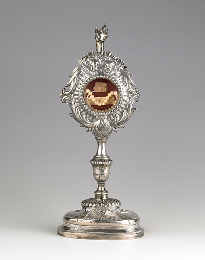 Reliquaire pédiculé en argent et en métal argenté. Pied ovale, noeud, monstrance avec hublot circulaire central en verre. L'intérieur contient une relique (os ?), un bijou en perles, une étiquette portant le nom de saint Point. Le reliquaire est surmonté par une main tendue. Décor gravé.