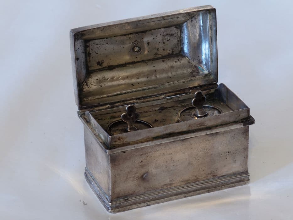 Coffret en argent rectangulaire, à couvercle en degrés, surmonté d'une croix latine plate. A l'intérieur, deux ampoules S.O et S.C à boutons tréflés.