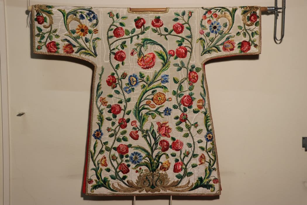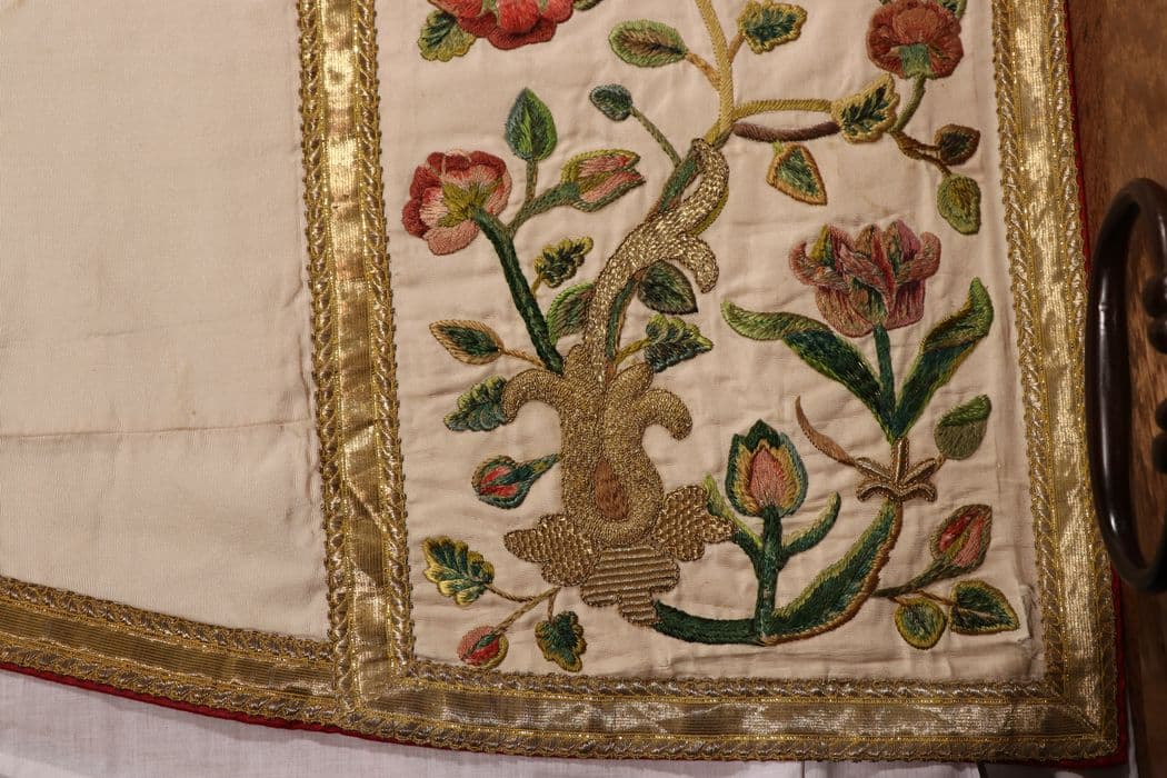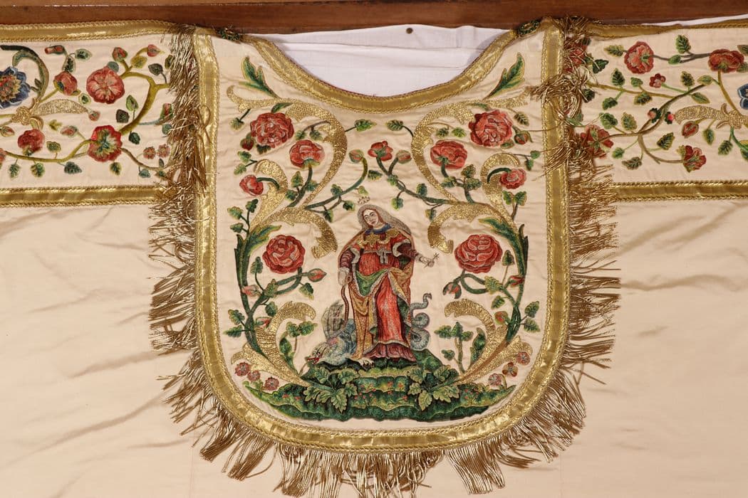 ornement liturgique catholique ; chape ; dalmatique (2) ; chasuble ; étole (2) ; voile de calice ; manipule (3)