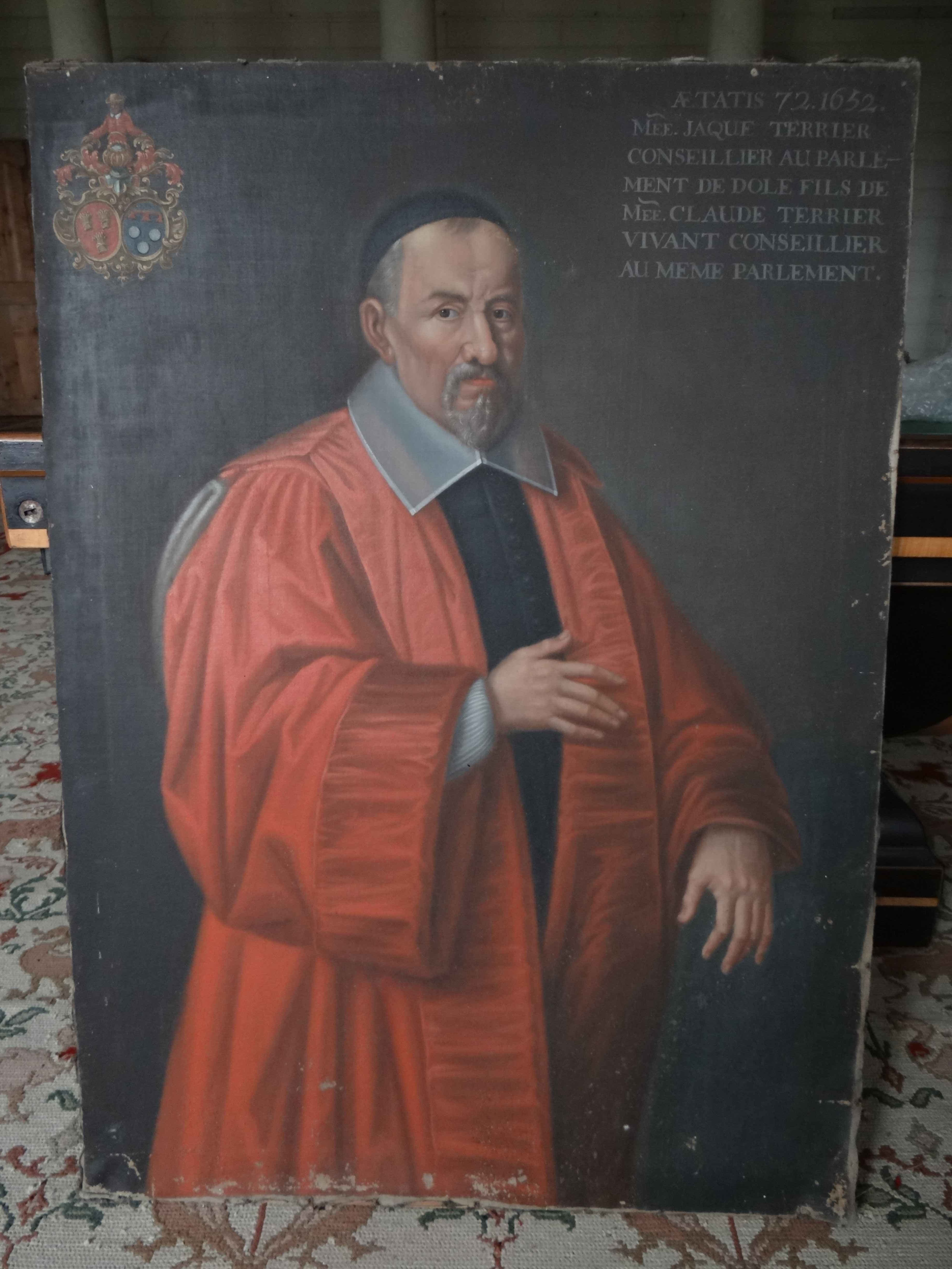 Inscription ; AETATIS 72.1652. / Mee. JAQUE TERRIER / CONSEILLER AU PARLE- / MENT DE DOLE FILS DE / MEE CLAUDE TERRIER / VIVANT CONSEILLER / AU MEME PARLEMENT