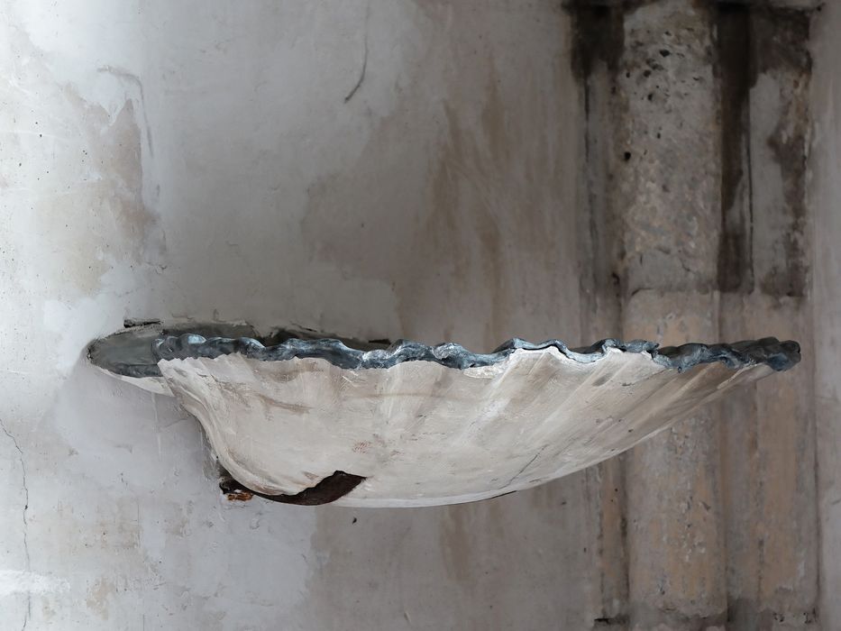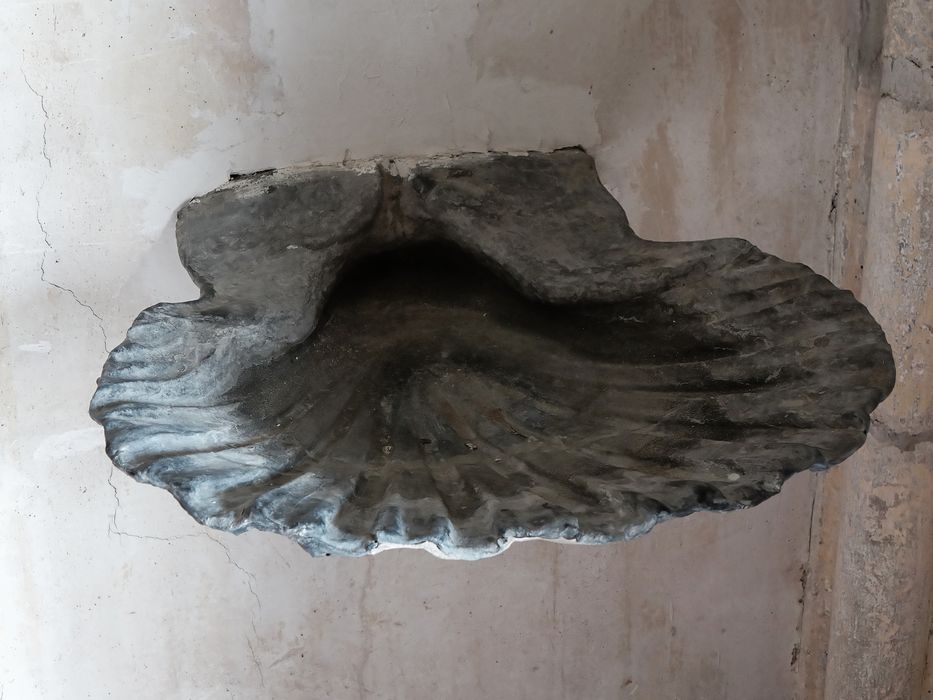 Bénitier en calcaire sculpté en forme de coquille, avec revêtement de plomb à l'intérieur, scellé dans le mur et reposant sur 2 pattes métalliques disposées en V.