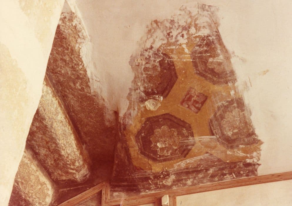 Décor des façades principale et latérale, des murs de l'escalier. Le décor peint sur le crépi des murs comprend des fausses briques de couleurs différentes figurant des losanges et des croix, de fausses pierres autour des baies et des chaînes d'angles en trompe-l'oeil : deux bandes horizontales de rinceaux. Sur les murs de l'escalier se retrouve le décor de rinceaux des façades. Décor des plafonds des paliers de l'escalier : faux caissons, rosaires et anges dans les tons ocres, bruns et rouges.