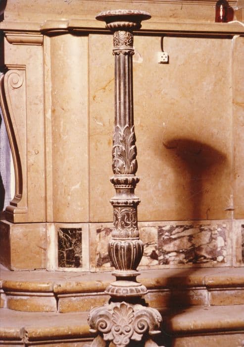 Chandelier composé de plusieurs éléments en métal : une base, une tige et une bobèche. Bobèche composée d'un binet (petite coupe percée) et d'une douille permettant de maintenir droit le cierge. Bobèche godronnée et décorée d'une frise d'oves en partie supérieure. Tige de forme balustre avec un fût cannelé et décoré de feuilles d'acanthe et de godrons. Chacun des candélabres présente un socle de forme triangulaire surmonté d'un pied tripode composé de trois pattes griffées (griffon ou lion) qui s'épanouissent en leur centre par des motifs de volutes, de palmettes et de feuilles d'acanthe.