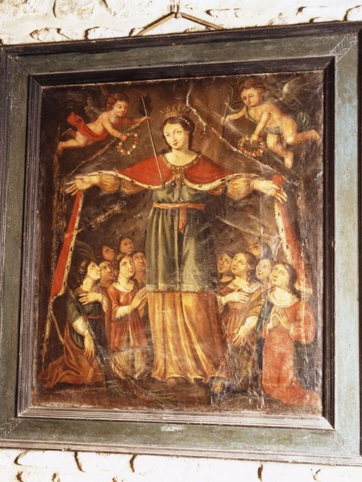 sainte Ursule protégeant les onze mille vierges dans son manteau ; ange : palme, couronne