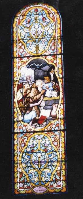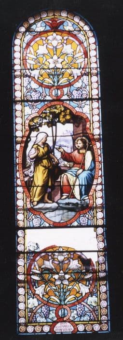 POP | Plateforme ouverte du patrimoinedix verrières de la nef et du transept : Sainte Famille à l'atelier, Christ et Samaritaine, Tentations de saint Antoine, Remise du rosaire, Saint Antoine de Padoue, Mort de saint Joseph, Charité de saint Martin, Mort d'un saint, Apparition de Lourdes et Apparition du Christ à une religieuse