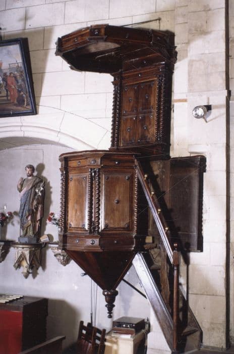 Chaire à prêcher ornée de colonnes torses, sans décor figuré, avec escalier et abat-voix cloutés.