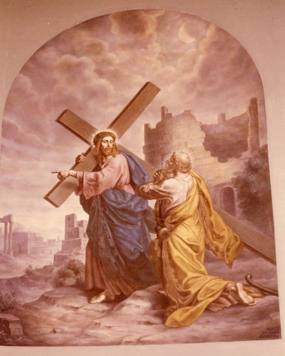sept tableaux : Apparition de Notre-Dame de Lourdes, Portement de croix, Assomption de la Vierge, Apparition du Sacré-Coeur, Pentecôte, Mort de saint Joseph et Cène